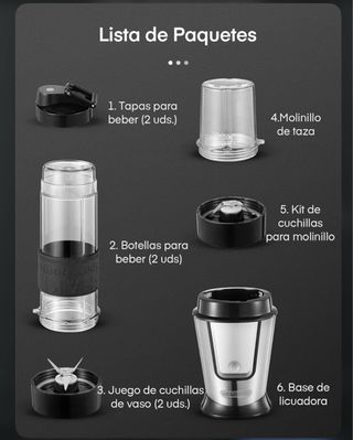 Set de batidora, picadora y procesadora de alimentos con varios accesorios. - 2 Tapas para beber. - 2 Botellas para beber. - 2 Juegos de cuchillas de vaso. - 1 Molinillo de taza. - 1 Kit de cuchillas para molinillo. - 1 Base de licuadora. 4 cuchillas de mezcla rápida, Apto para lavavajillas, Bloqueo de seguridad, Licuadora personal multifunción, Portátil Funcionalidades: Incluye accesorios para mezclar, picar y batir. • Motor: Cuenta con una base de motor potente. • Uso: Diseñado para la preparación rápida de alimentos y bebidas. • Seguridad: Incluye una advertencia de seguridad para mantener el producto fuera del alcance de los