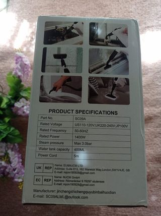 Limpiador a vapor de alta eficacia Power Vapore. - Diseño giratorio 360° con asa de transporte. - Capacidad de 1200ml para hasta 30 min de uso continuo. - Salida de vapor de 30g/min (precalentamiento 7-9 min). - Presión máxima de 3 bar / 1.5-3.5 bar. - Cable de seguridad de 3 metros. Como se puede apreciar en las fotos, no se a sacado de su envoltorio nunca. Hs estado en el trastero hasta la fecha. Si quieres verla y probarla sin problema ni compromiso GRACIAS!!!! 😄