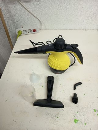 Limpiador a vapor compacto y potente, ideal para diversas tareas de limpieza. Prácticamente nuevo, apenas ha tenido uso. - Incluye accesorios para diferentes usos. - Diseño ergonómico para un manejo cómodo.