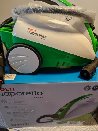 Limpiador a vapor Polti Vaporetto Smart. - Color blanco y verde. - Diseño compacto y con ruedas para fácil transporte. - Incluye manguera y accesorios.