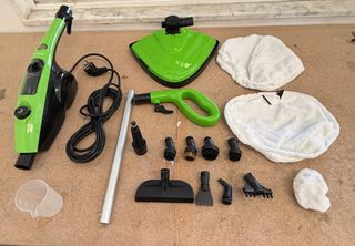 Mopa de vapor H2O Mop x5 en color verde. - Mango extensible. - Depósito de agua. - Cable de alimentación. Es un sistema de limpieza a vapor 5 en 1, que funciona como limpiador de pisos, vaporizador de alfombras, limpiador de ventanas, vaporizador de prendas y limpiador de mano. Utiliza vapor de agua a alta temperatura para limpiar y desinfectar, eliminando bacterias y hongos sin necesidad de productos químicos agresivos. Es versátil y se puede usar en una variedad de superficies, incluyendo mármol, cerámica, piedra, linóleo, pisos de madera sellada y parquet. incluye varios accesorios.