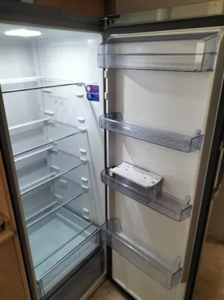 Nevera Beko de acero inoxidable. - Diseño moderno y elegante. - Amplio espacio interior. - Estantes ajustables.