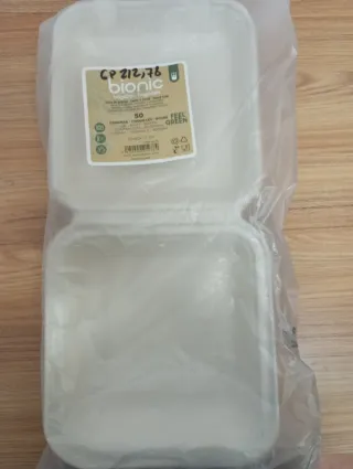 Pack de 50 unidades. Recipiente con tapa cuadrado, de la marca Bionic. - Material: Feel Green (de pulpa natural de caña de azucar) - Medidas: 20x20x7.5 cm.