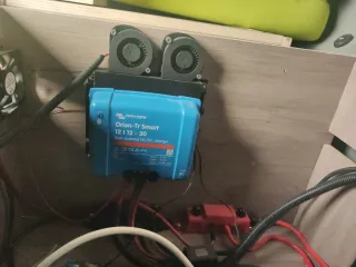 Booster Orión para cargar bateria secundaria en autocaravana o camper. Además incluyo soporte y 2 ventiladores de 12 voltios para su refrigeración y así aumentar su vida útil