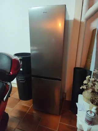 Frigorífico de la marca Candy con acabado en color plateado. - Diseño moderno y elegante. - Dos puertas. - Compartimento congelador en la parte inferior.