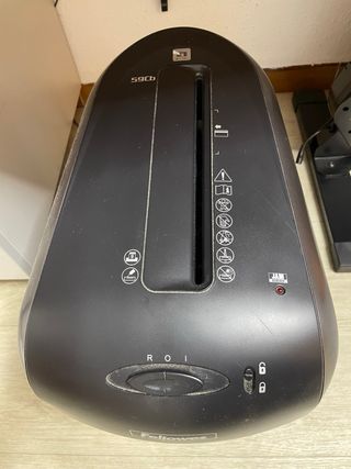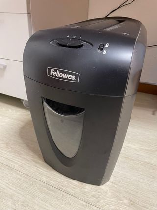 Destructora de papel de la marca Fellowes. Diseñada para triturar documentos de forma segura y eficiente. - Color negro. - Ventana transparente para ver el nivel de llenado. - Panel de control con indicadores luminosos. En perfecto estado y funcional, ideal hogar u oficina.