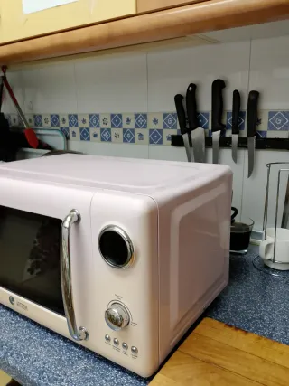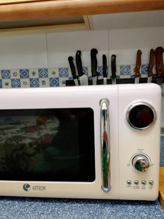 Microondas de diseño retro en color rosa pastel, con acabados cromados. - Marca: ARTROM - Color: Rosa pastel - Tirador y detalles cromados Está el frontal un poco decolorado
