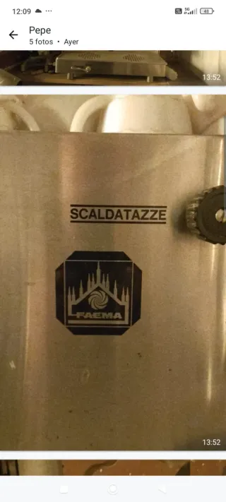 Cafetera italiana profesional Faema, ideal para los amantes del café. - Diseño clásico en acero inoxidable. - Doble grupo para preparar dos cafés a la vez. - Incluye molinillo de café. -años 70