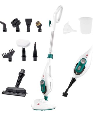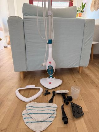 Limpiador a vapor versátil para diversas tareas de limpieza. Incluye varios accesorios para diferentes superficies. - Múltiples boquillas y cepillos. - Depósito de agua. - Embudo y jarra medidora. Elimina hasta el 99,9 % de virus, bacterias y gérmenes solo con vapor de agua. Equipada con 1500W, esta mopa de vapor genera un potente flujo de vapor constante que limpia en profundidad todo tipo de superficies. Desinfecta sin esfuerzo suelos duros, alfombras, juntas, ventanas, sanitarios, sofás, colchones, ropa o incluso el interior del coche.
