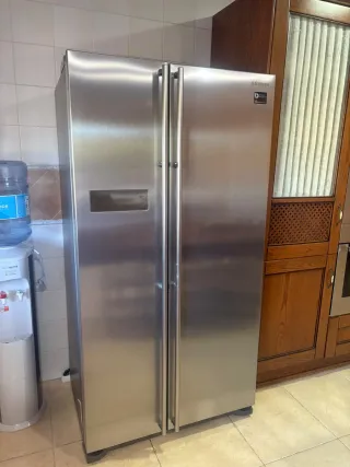 Frigorífico de doble puerta de la marca Samsung, con acabado en acero inoxidable. - Diseño moderno y elegante. - Tiradores metálicos.