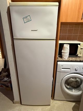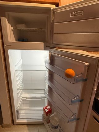 Nevera de color blanco con estantes interiores y cajones. Funciona perfecto - Estantes de cristal. - Botellero metálico. - Cajón inferior. - Puerta con compartimentos.