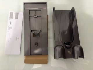 Base de carga para pared de aspiradora Dyson V15. No incluye tornillos y tacos para su instalación, ni cargador. (Solo es la base de plástico). Está completamente nueva, sin uso, la vendo por tener una base cuelga accesorios que compré aparte. - Color gris oscuro. - Fabricada en plástico resistente. - Diseñada para colgar en la pared