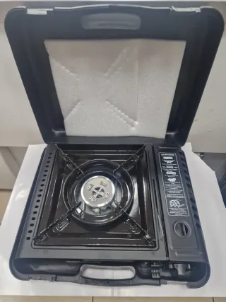 Hornillo portátil de gas, ideal para camping o exteriores. Incluye maletín para transporte. - Diseño compacto y ligero. - Encendido electrónico. - Control de llama ajustable.
