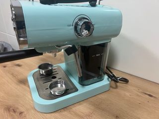 Cafetera de expreso con un encantador diseño retro en color menta. Perfecta para preparar tu café favorito en casa. - Acabado en color menta. - Diseño retro. - Incluye portafiltros.