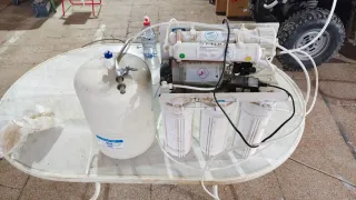 Sistema de tratamiento de agua por osmosis inversa. - Incluye tanque de almacenamiento. - Grifo dispensador. - Múltiples etapas de filtración.