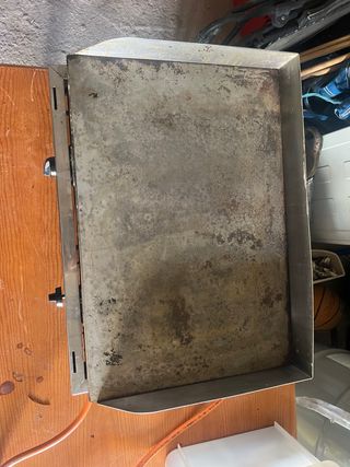 Plancha de cocina de gran tamaño, ideal para preparar comidas. - Superficie metálica. - Bordes elevados.