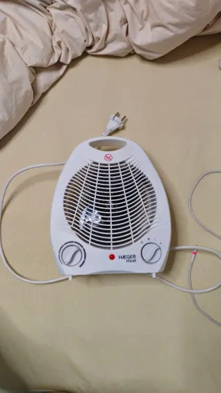 Calefactor eléctrico portátil de la marca Haeger Heat. - Color blanco. - Diseño compacto y fácil de transportar. - Dos niveles de potencia seleccionables mediante dial. - Indicador luminoso de encendido.