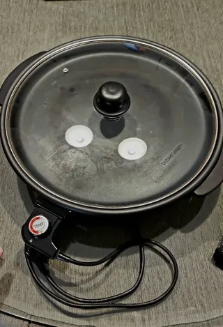 Plancha eléctrica redonda con una potencia de 1400W. Ideal para preparar una variedad de alimentos. - Superficie antiadherente. - Tapa de cristal con asas. - Control de temperatura ajustable. - Medidas : diámetro total 43cm diámetro útil 38 cm.