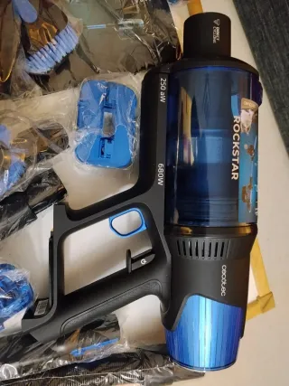 Aspirador de mano Cecotec Rockstar 8500, con 680W de potencia y 250 aW de succión. - Diseño ergonómico en color negro y azul. - Tecnología Direct Cyclone. - Incluye accesorios. - falta batería solamente lo demás todo nuevo