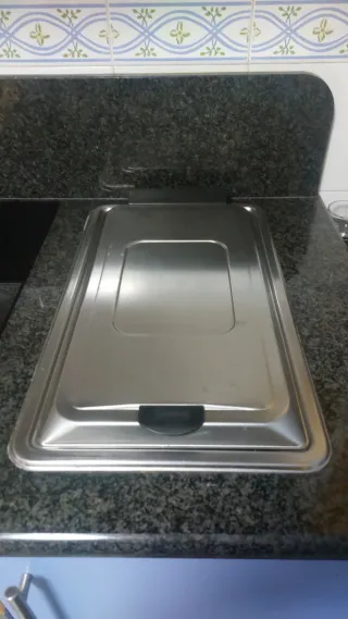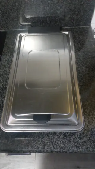 Freidora de la marca Movilfrit de aceite y agua Completa con bandeja inferior para suciedad. - Cuerpo de acero inoxidable. - Tapa negra. - Control de temperatura.