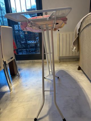 Tabla de planchar de la marca Jata, de tamaño reducido. Muy fácil de guardar y de usar, o para llevar de viaje. Con gancho para colgar en el armario y patas metálicas plegables. Se puede colgar totalmente plano. Completamente nueva, sin usar.