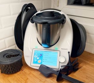 Robot de cocina Thermomix. - Diseño moderno en color blanco. - Pantalla táctil. - Dial giratorio para ajustes.