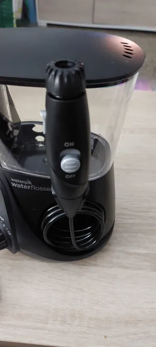 Irrigador bucal Waterpik en color negro. - Depósito de agua transparente. - Mango con control de encendido y apagado. - Manguera enrollada para almacenamiento.