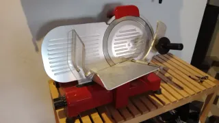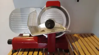 Cortadora de fiambre de color rojo. - Cuchilla de corte. - Protector de seguridad. - Bandeja de alimentación.