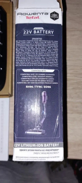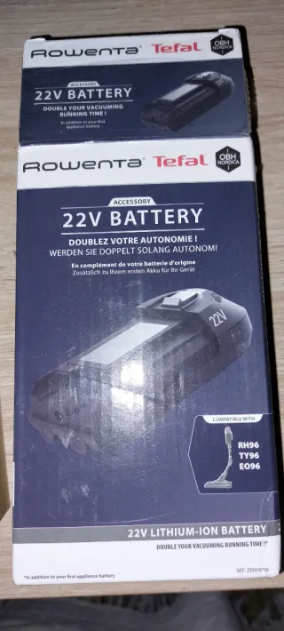 Batería de litio-ion de 22V para aspiradoras Rowenta y Tefal. Permite duplicar el tiempo de aspirado. - Compatible con modelos RH96, TY96, E096. - Voltaje: 22V. - Tipo: Litio-ion.