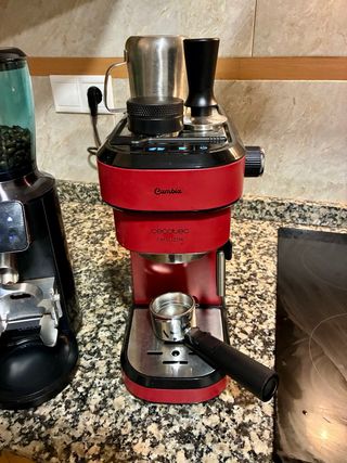 Cafetera de la marca Cecotec, modelo Cumbia. Su diseño es compacto y moderno, en un llamativo color rojo. - Incluye varios portafiltros: sin presurizar Barista, los originales, acople para hacer cápsulas. - Tamper y distribuidor - Jarra para espumar - Depósito de agua. - Panel de control. precio no negociable