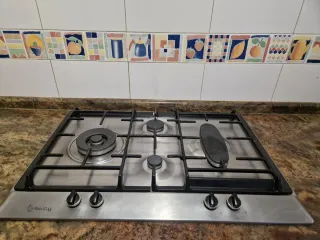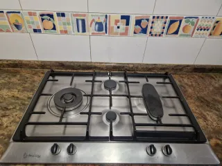 Cocina a gas de la marca Balay con cuatro quemadores. Funciona bien. Hueco encimera min : 55x46cm Dimension total : 76x52cm Solo recogida. - Encimera de acero inoxidable. - Parrillas de hierro fundido. - Mandos frontales.