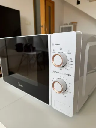 Microondas con grill de sobremesa en color blanco con detalles en dorado. Cuenta con panel de control con diales. 422x329x237,5mm largo-profundidad-altura - Marca: Midea - Color: Blanco y dorado - Panel de control con diales para potencia, tiempo y descongelación.
