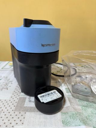 Cafetera Nespresso de color azul y negro. Incluye un recipiente transparente para cápsulas y un paquete de cápsulas. - Diseño moderno. - Materiales de calidad.