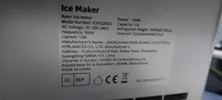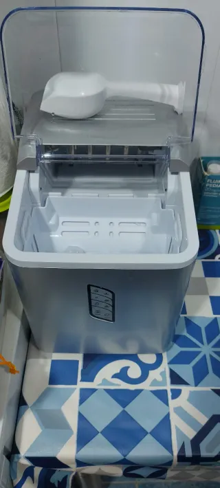 Máquina para hacer hielo de diseño moderno y compacto. - Panel de control con indicadores. - Acabado en color blanco y plateado.