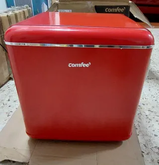 Nevera compacta de color rojo, con un diseño retro y elegante. Ideal para espacios pequeños. - Acabado brillante. - Detalle cromado en la parte superior. Presenta un golpe lateral izquierdo trasero no muy visible y en la parte superior alguna rozadura superficial