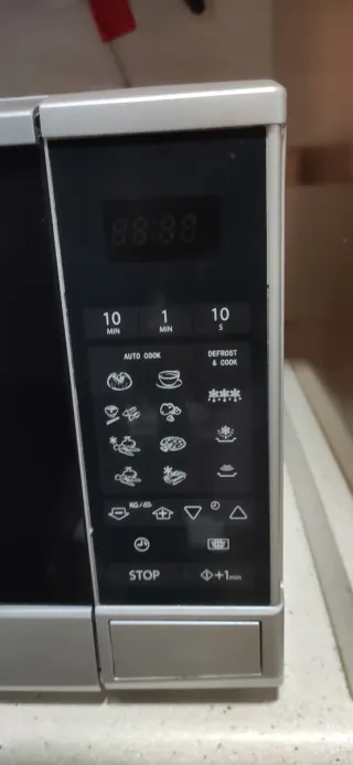 Microondas Sharp R270S en color plateado y negro. Para piezas genial. O lo que consideres. Saltan los plomos al enchufarlo. Desconozco el motivo. Potencia del microondas: 800 W. Capacidad: 20 litros. Cuenta con 10 niveles de potencia. Incluye 8 programas automáticos de cocción (pasta, pizza, palomitas, patatas...).