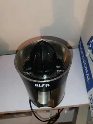 Exprimidor de la marca Alfa. - Diseño moderno en acero inoxidable y plástico transparente. - Compacto y fácil de usar.