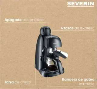 Cafetera espresso compacta Severin, ideal para casa u oficina. Prepara hasta 4 cafés espresso y tiene espumador de leche para capuchinos, latte o flat white. Diseño moderno, fácil de usar y fabricada con materiales de calidad. Marca alemana fiable y duradera. Incluye - Cafetera de espresso. - Jarra de cristal. - Vaporizador para leche. - Medidor - compactador de cafe