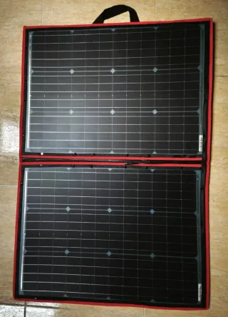 Kit de Panel solar 110W plegable y portátil, ideal para llevar a cualquier parte. Su diseño permite un fácil transporte y despliegue. Está nuevo. - Celda solar monocristalina de alta eficiencia. - Incluye controlador solar para configurar dos salidas USB: cargador solar para todas las baterías de 12 V, con voltaje de alimentación óptimo de 18 V. - Incluye varios cables para diferentes conexiones. - Estructura resistente y duradera. - Ideal para usar en coches, motos, barcos, camping, picnic, senderismo, cargar tu batería de coche o situaciones de emergencia. Entrega en mano, NO envío.