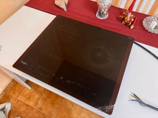 Placa de inducción Whirlpool - WS B4760 NE con desperfecto visible en la esquina. Funciona correctamente. Simplemente tiene la esquina inferior derecha con el cristal roto como se aprecia en las imágenes. El resto de la placa no tiene grietas ni nada, solo es ese trozo que se ha roto. Tiene 3 quemadores de inducción con mando control touch independiente. Dimensiones: -Ancho: 59cm -Profundidad: 51cm -Altura: 5.4cm -Anchura mínima del nicho 56.0cm -Anchura máxima del nicho 56.2cm -Fondo del hueco: 48.0cm Puedo entregarla en mano en Manzanares o Valdepeñas. Si fuese necesario también podría llevarse a Ciudad Real