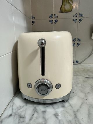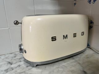 Tostadora SMEG de gran tamaño en color crema. Un electrodoméstico con un diseño retro y elegante. - Acabado en color crema. - Logo de la marca SMEG en relieve.