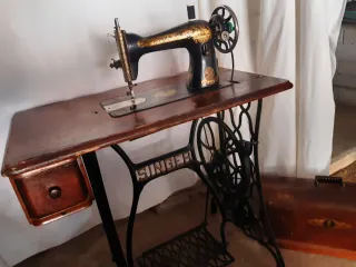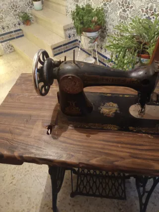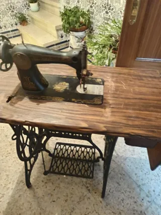 Máquina de coser antigua con su mueble original. Un objeto con encanto para coleccionistas o decoradores. - Diseño clásico y ornamentado. - Mueble de madera con detalles. - Incluye pedal de pie.