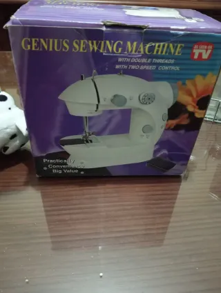 Máquina de coser portátil Genius Sewing Machine. Compacta y fácil de usar, ideal para arreglos rápidos y principiantes. Doble hilo, dos velocidades, pedal, adaptador y accesorios incluidos. Funciona a corriente o pilas. Se entrega con su caja original. Práctica y cómoda para casa. #maquinadecoser #costura #hogar #portatil #bricolaje