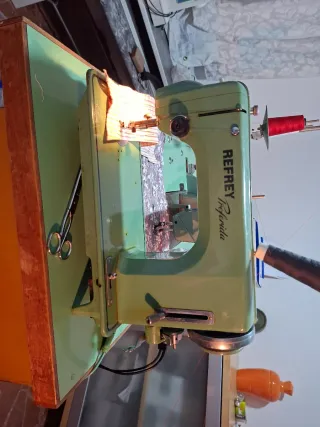 Máquina de coser Refrey con motor instalado. - Color verde. - Incluye accesorios.