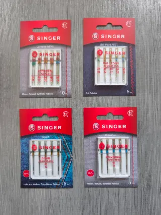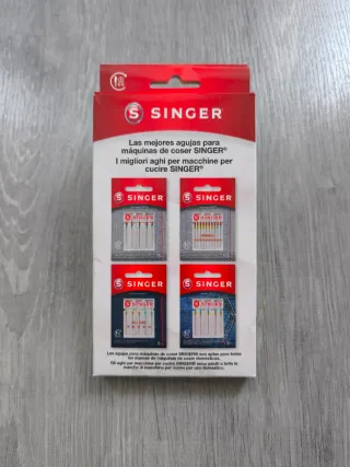 Pack de agujas originales SINGER para máquinas de coser. Contenido: - Surtido Universal (grosores de aguja 2x70/10, 6x80/12, 2x90/14), tamaño del paquete: 10 unidades. - Surtido Ball Point (grosores de aguja 1x70/10, 2x80/12, 2x90/14), tamaño del paquete: 5 unidades. - Agujas Denim, grosor de aguja 80/12, tamaño del paquete: 5 unidades. -Surtido Universal (grosores de aguja 5x90/14), tamaño del paquete: 5 unidades.