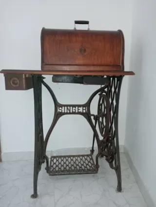 Con más de cien años de antiguedad. Máquina de coser Singer con base de hierro fundido y tapa de madera. - Base de hierro fundido con detalles ornamentales. - Tapa de madera con asa. - Pedal de pie. - Marca Singer visible en la base.