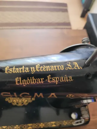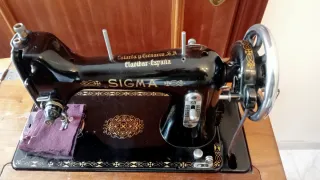 Máquina de coser vintage de la marca Sigma, fabricada en Elgoibar, España. - Diseño clásico en color negro con detalles dorados. - Fabricada en metal resistente.