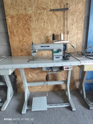 Máquina de coser industrial FOMAX, ideal para trabajos de costura. - Modelo KDD 5670. - Incluye mesa de trabajo y pedal. - Hilo de coser negro y beige.