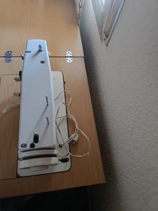 Mesa de trabajo para máquinas de coser, incluye motor y pedal. - Superficie de trabajo con marcas de medición. - Estructura metálica robusta. - Pedal para control del motor.