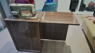 Mueble para máquina de coser Singer, con una combinación de materiales que le otorgan un estilo clásico. Estructura de metal resistente. Superficie de madera (tiene algo de carcoma, poca en el tablero de arriba. Diseño icónico de la marca Singer. Medidas: De la madera, larga 110 cm, con la extensión abierta. Sin la extensión 89 cm. Fondo 41 cm. Cuadro donde va la máquina, 36 x 17 cm. Pie de hierro de la maquina, altura 72 cm. Largo de arriba, 53 cm. Largo de abajo 55 cm. Fondo de arriba 33.5 cm. Fondo de abajo 47 cm. En un lateral tiene ruedas.